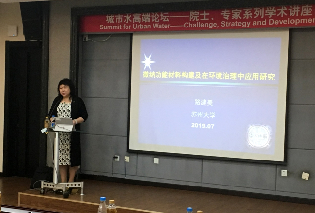 2019年7月17日下午14:00,苏州大学党委副书记、副校长路建美教授做客我校环境学术沙龙活动,并为我校师生带来题为“微纳功能材料构建及在环境治理中应用研究”的报告。报告中,路建美教授详细阐释了如何设计构建微纳环境功能材料,并将其应用于污染物的去除与降解。针对低浓度污染物深度处理和高浓度污染物回收资源化这两个环境处理的难题,路教授分别介绍了相关功能材料的作用机制及应用情况。